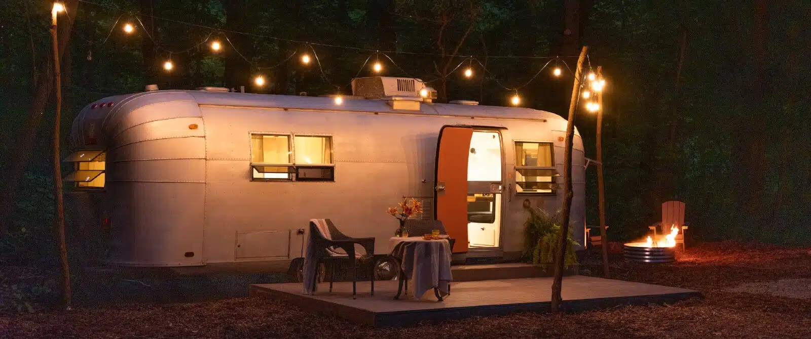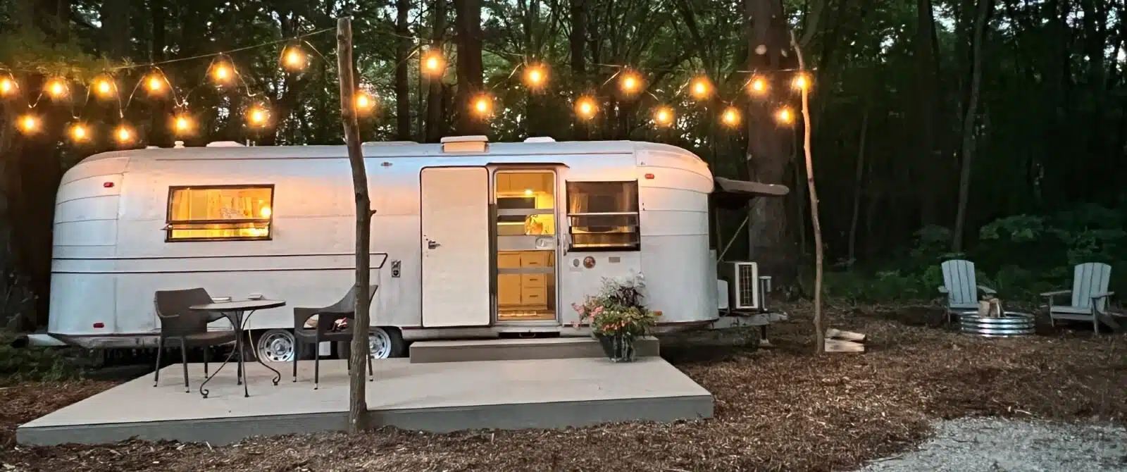 Campers provide private accommodations for couples under the trees. Each camper features a bathroom with small tub/shower, kitchen, luxury bedding, deck and outdoor seating, fire pit, and gas grill. Campers are pet friendly and require a three-night minimum.